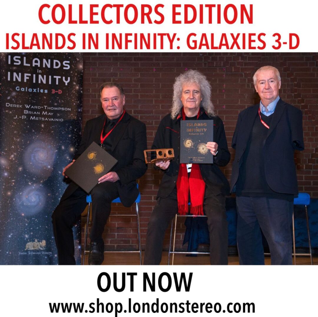And today, Brian May, J-P Metsavainio, and Derek Ward-Thompson are in London’s Kensington at leading astronomy festival , AstroFest, launching the lavish “special edition” version of Islands In Infinity: Galaxies 3-D, with glorious gold, a slick slipcase and a bookplate signed by the authors. At 4.30pm the authors will also be presenting their latest book to a public audience for the first time.