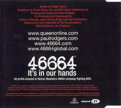 In 2007 – Queen+PR released enhanced CD single “Say It’s Not True” + CD ROM Video of same. Royalties worldwide donated to Nelson Mandela Foundation. (Download was available for World Aids Day that year.)